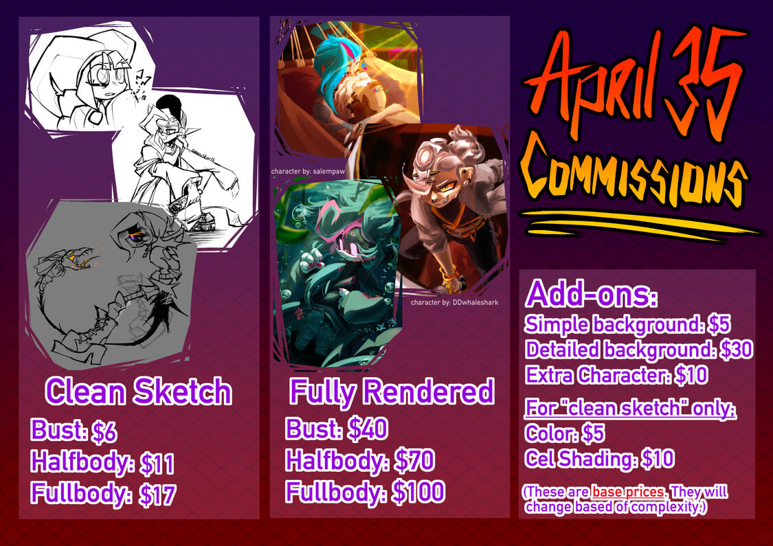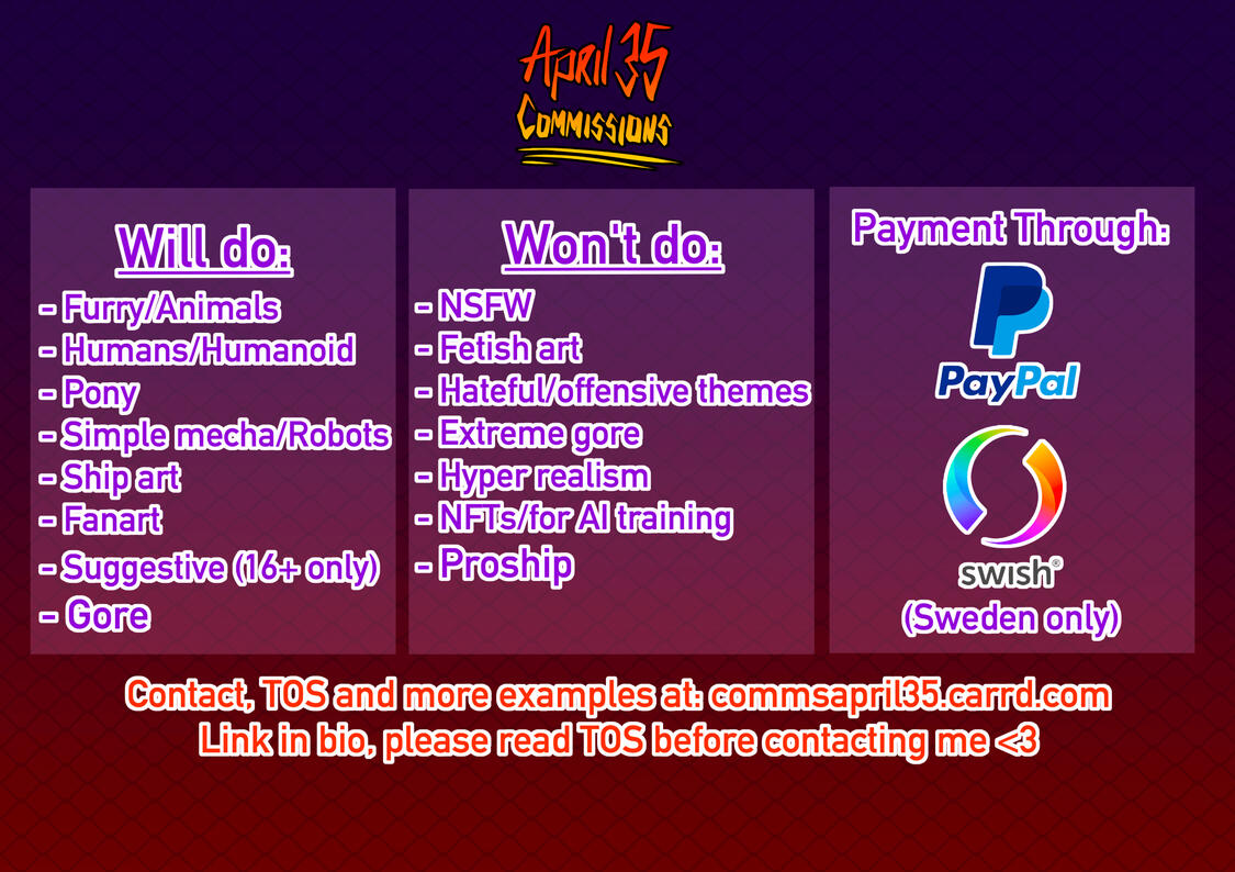 - By commissioning me you agree to my terms of service, breaking them will result in a partial refund and being blacklisted.- My commissions are for personal use only. The exception being for decorative uses in profiles or streams. I do not currently take commercial commissions.- Using my work for training AI or NFT is prohibited.- I intend to use the commission for portfolios, examples for future commissions and post it to my social medias. If you do not wish me to post your commission please let me know, however do be mindful that it will at least be used in my portfolios.- I have the right to refuse a commission for any reason.- Commissions will take longer depending on my availability, I am still a student so please have patience. Commissions with deadlines may be subject to extra fees depending on how close the deadline is.- Reposting/Sharing your commission is allowed, please always credit me (@ZerrySilver88).- Being rude, aggressive or inappropriate will result in a cancelation of your commission.Payment- Payment will be through Paypal, If you live in Sweden I can accept/prefer payments through Swish.- Before I begin working on the commission I will ask for a 50% deposit (NON-REFUNDABLE AFTER SKETCH) of the price.- In the case of cancelation before the sketch is finished/approved I will offer a 25% refund.- If I cannot complete a commission, I will offer a partial refund (no lower than 25%) depending on the progress I've done on the commission.- The prices listed in my commission sheet are the base prices. Depending on complexity and extras the price will change.Process- I will be providing updates whenever a step of the process has been completed (sketch, flats, etc). You may ask for more updates on certain parts of the commission.- You are entitled to 4 changes during the sketch and flats phases. More changes and/or changes during further progress of the commission will be subject to extra fees (price changes based on complexity and phase).- Visual references are preferred over written descriptions, if the description is far too complicated with little-to-no visual references it may be rejected/subject to extra fees.- Once the artwork has been accepted and paid for it will be emailed to you as a full res png + a lower res png with watermark for posting.